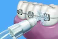 The Orthodontic Tip is designed with a tapered brush on the end to help remove plaque that sticks to the brackets and between your teeth. It also helps flush out the bacteria and food debris from around teeth and under the gums.